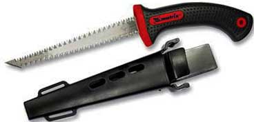 Хочу рассказать еще про один вариант – нож с мини-ножовкой. Это отличное решение по той причине, что на ноже есть небольшая ножовка, которой очень удобно пилить изгибы и фигурные участки. Мне не понравилось только то, что лезвие у ножа 9 мм, ножовка, конечно, хороша, но узкое лезвие для резки гипсокартона не подходит, слишком оно слабое.