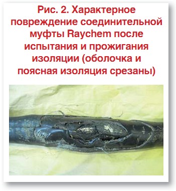 Но особую озабоченность при эксплуатации вызывает выход из строя соединительных термоусаживающих муфт. В них повреждение возникает по краю соединительной гильзы жил кабеля на сетку, соединенную с его оболочкой (рис. 2).